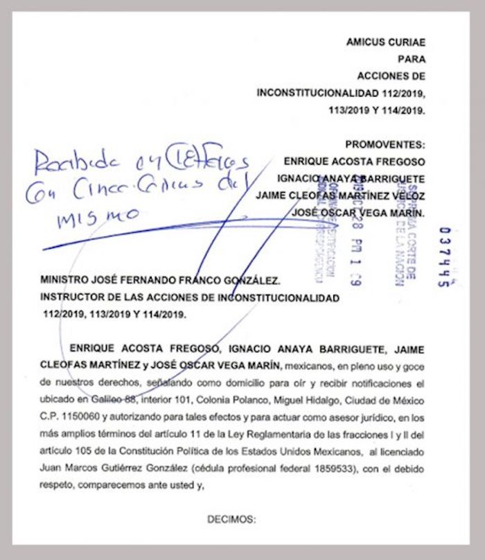 El amicus curiae igualmente fue agregado al expediente 112/2019 y su admisión implica que la Corte otorga derecho de audiencia a los “promoventes”, quienes deberán comparecer ante la Coordinación de la Ponencia del Ministro Instructor en aras de fijar fecha para tales efectos.