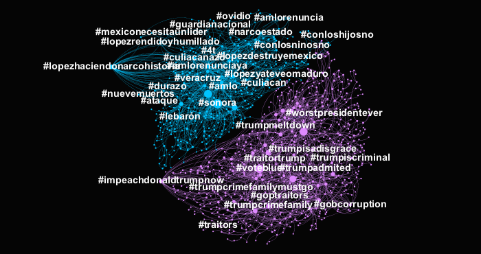En esta dinámica, la cuenta del Presidente estadounidense generó una actividad altamente centralizada, debido a que convergieron grupos pro y anti AMLO, así como los seguidores de Trump que mantienen alta actividad en la Red por el periodo de campaña. Una revisión posterior arrojó que gran parte de la actividad de usuarios que defendieron a Trump se originó de manera no orgánica, con concentraciones de cuentas que por sus atributos presentan altas posibilidad de ser administradas de manera artificial.