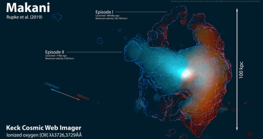 La galaxia en la que se observó ese fenómeno se llama SDSS J211824.06 + 001729.4, también conocida como "Makani". Según Alison Coil, profesora en la Universidad de California en San Diego (EU), y una de las autoras principales del estudio, Makani no es una constelación típica y es el resultado de la fusión de dos galaxias masivas, "que se unieron debido a la atracción gravitatoria que cada una sentía a medida que se acercaban".