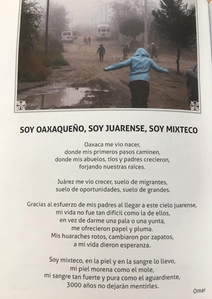 Al decidir junto al colectivo –es decir, los otros autores de Versos de mi corazón– cuáles temas desarrollarían, optaron por enfocarse en su vida en estas coordenadas y en cómo los afectó la migración de manera positiva o negativa. Todos acudieron a los talleres que Pedro Uc Be, escritor maya, impartió para ellos en una de las bibliotecas de la Universidad Autónoma de Ciudad Juárez.