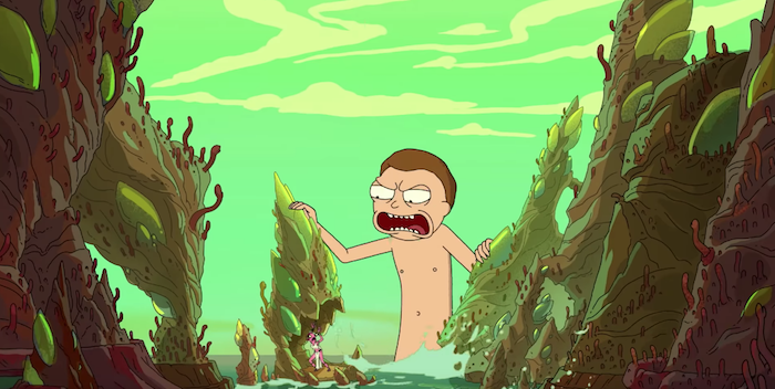 Por último puede observarse lo que parece una versión alternativa de Morty emergiendo, cual Godzilla, de una masa de agua y a Rick enfrentándose con las armas que tiene ocultas en la nevera a un ganso de dos cabezas.