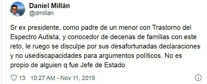 Padres de familia exigieron que se disculpara por ello y se hiciera responsable de sus acusaciones: "Sr ex Presidente, como padre de un menor con Trastorno del Espectro Autista, y conocedor de decenas de familias con este reto, le ruego se disculpe por sus desafortunadas declaraciones y no use discapacidades para argumentos políticos. No es propio de alguien que fue Jefe de Estado".
