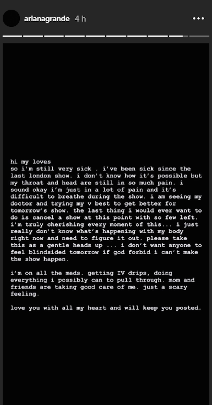 “Hola mis amores, todavía estoy muy enferma. He estado enferma desde el último show de Londres. No sé cómo es posible, pero todavía me duele mucho la garganta y cabeza. tengo mucho dolor y es difícil respirar durante el espectáculo. Estoy viendo a mi médico y tratando de mejorar para la presentación de mañana”, escribió en una Storie de la red social.