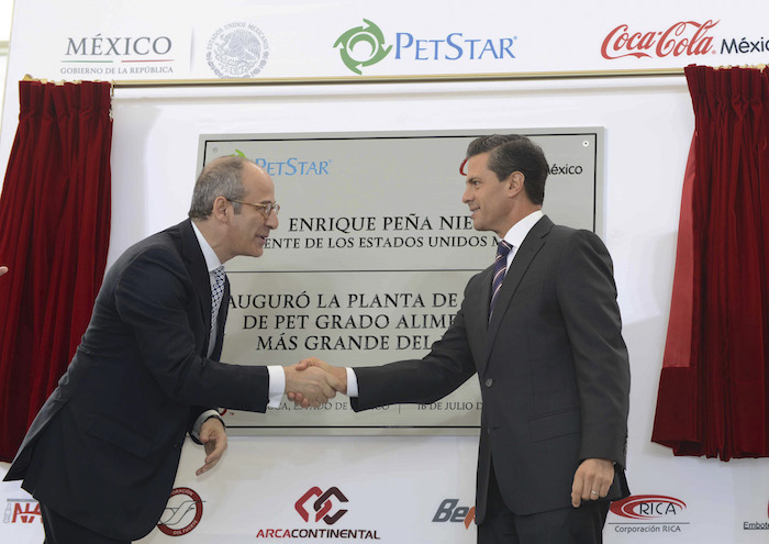 Ahmet Bozer, presidente de Coca Cola Internacional y Enrique Peña Nieto, presidente de México, durante la inauguración de la Planta de PET Reciclado Grado Alimenticio más grande del mundo en 2014. Foto: Cuartoscuro