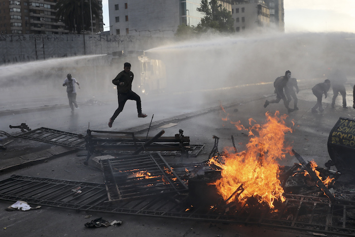 Foto de archivo del 29 de octubre de 2019, de manifestantes antigubernamentales huyendo de los cañones de agua de la policía junto a una barricada colocada por las calles de Santiago de Chile. Foto: Rodrigo Abd, Archivo, AP