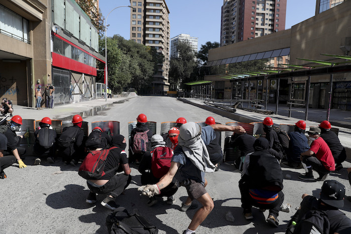 Los manifestantes antigubernamentales se agachan detrás de escudos improvisados hechos de barriles de metal durante enfrentamientos con la policía en Santiago, Chile, el jueves 14 de noviembre de 2019. Foto: Esteban Félix, AP