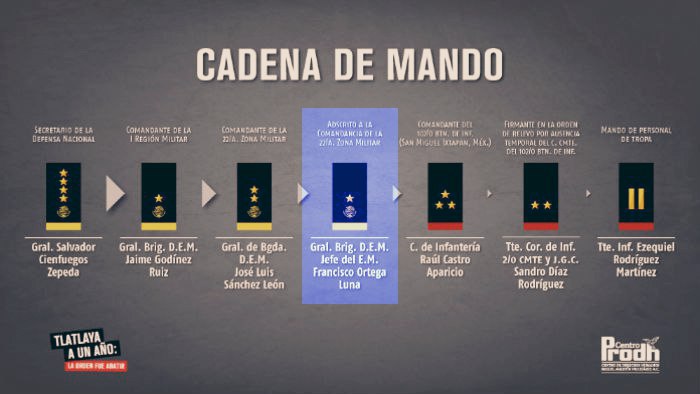 “Conforme a la estructura militar, la investigación de las responsabilidades de mando supondría indagar desde al Teniente de Infantería Ezequiel Rodríguez Martínez, quien estaba al mando del personal de tropa; luego, de acuerdo a la cadena de mando, también se deberá investigar a Coronel Raúl Castro Aparicio, Comandante del 102 batallón de Infantería en San Miguel Ixtapan; al General Brigadier Diplomado y Jefe del Estado Mayor, Francisco Ortega Luna, adscrito a la Comandancia de la 22 Zona Militar; al General de Brigada Diplomado del Estado Mayor, José Luis Sánchez León, Comandante de la 22 Zona Militar; y al General Brigadier Diplomado del Estado Mayor Jaime Godínez Ruiz, comandante de la I Región Militar, hasta al General Salvador Cienfuegos Zepeda, entonces Secretario de la Defensa Nacional”, se lee en el documento.