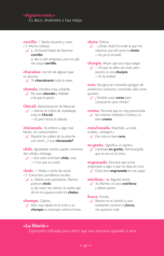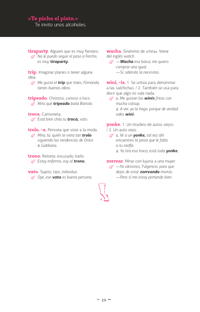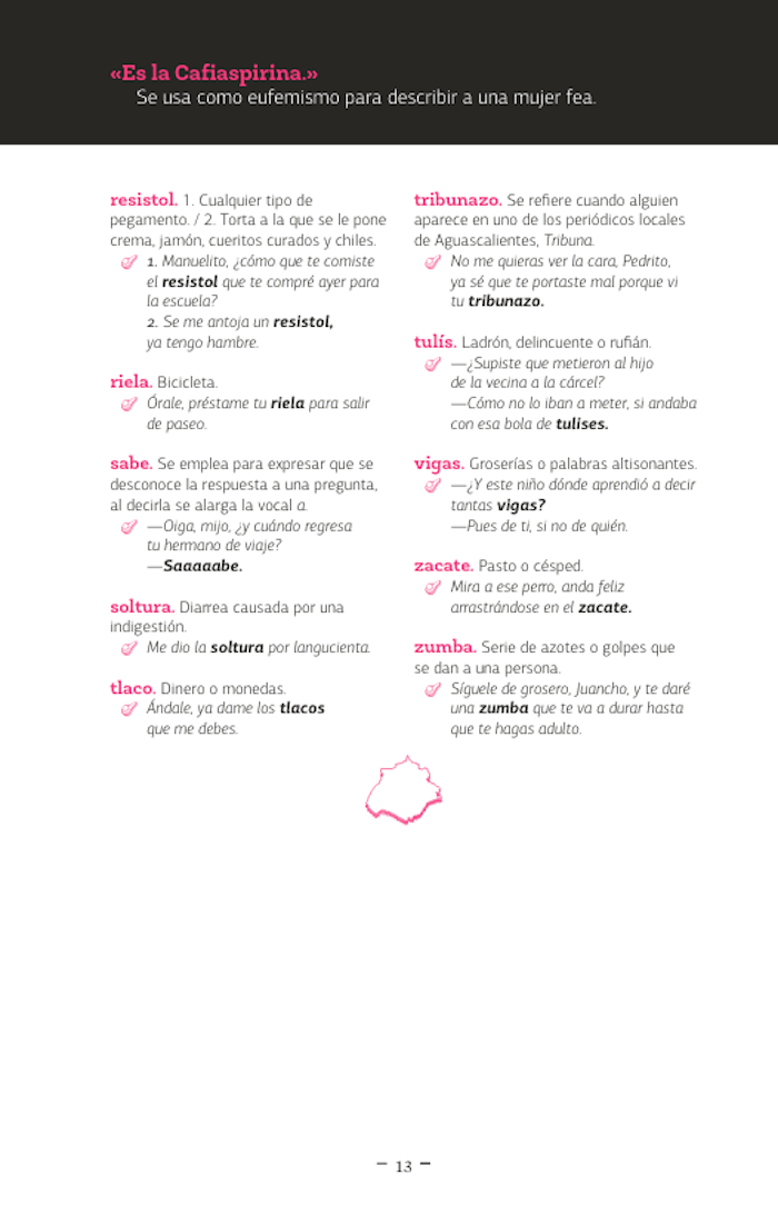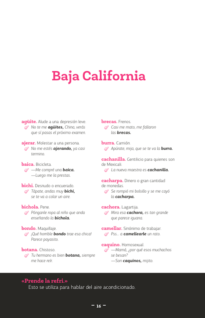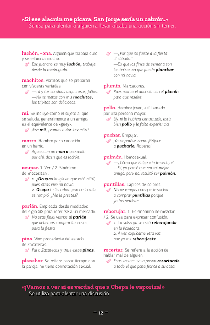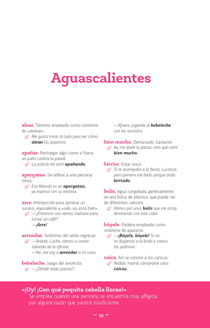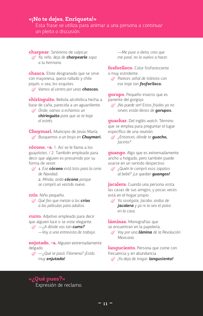El libro que ahora tiene en sus manos, este «diccionario de mexicanismos», es mucho más que una simple recopilación de palabras, palabrejas y palabritas de cada uno de los estados de nuestro país; es, probablemente, la guía definitiva del viajero que busca ser entendido dentro de su propio país donde todos no hablamos ya español, sino «mexicano». Es tan indispensable como traer el boleto del camión, los calcetines en pares y los calzones limpios... es decir: la llave para salir del terruño y atreverse a conocer al «otro» o mejor a la «otra» porque las palabras aquí contenidas guardan un mensaje de seducción que es otro de los riesgos del viajero: encontrar alguien a quien ligar. Así que disfrute estos mexicanismos y atrévase a jugar «bebeleche» en Aguascalientes, a tomarse un caldo de «bobox» en Campeche, a «chacalear» a una mujer hermosa en Colima, pero que nunca lo hagan «bochi» en Chiapas.