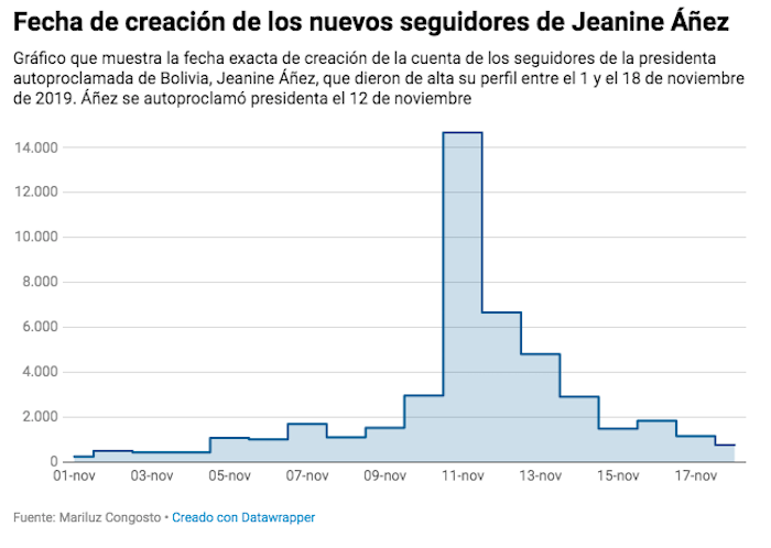 Según los datos publicados por el investigador argentino Rodrigo Quiroga, miembro del Consejo Nacional de Investigaciones Científicas y Técnicas (CONICET, dependiente del Ministerio de Ciencia argentino) y docente universitario, 52 mil 412 de los perfiles que siguen a Camacho se crearon en los últimos 15 días. En el caso de la autoproclamada Áñez sus seguidores novatos ascienden a unos 42 mil. Quiroga es uno de los científicos que ha compartido su base de datos en bruto con eldiario.es, que ha podido contrastar sus resultados.