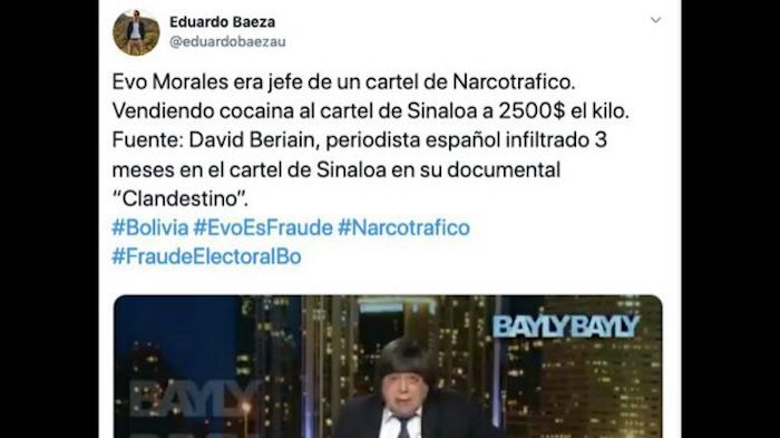 El caso más llamativo es el que se ha dado en #EvoEsFraude, cuyo comentario más compartido corre a cargo del estudiante boliviano radicado en Barcelona Eduardo Baeza, que va camino de los 13 mil 500 retuits. Desde la ciudad condal, Baeza acusó a Morales de ser "jefe de un cartel de narcotráfico" relacionado con el cartel de Sinaloa, denuncia que fundamenta en el trabajo del periodista David Beriain, autor del documental Clandestino (Discovery). "Es falso, en el documental no se afirma eso", aclara Beriain en conversación con eldiario.es.