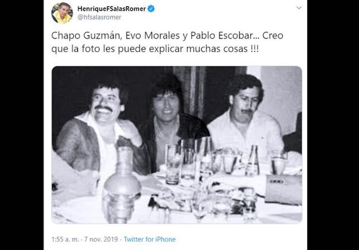 Las acusaciones de narcotráfico contra Morales se han distrubuido en casi todas las conversaciones en las que ha actuado el ejército de nuevas cuentas que amplía el mensaje de los líderes opositores. Se apoya tanto en desinformación, como la que intenta utilizar el prestigio de David Beriain, como en mentiras fabricados para atacar al líder indígena. Uno de estos últimos se distribuyó con especial intensidad en los primeros días tras el golpe, mostrando a Morales rodeado de narcos como Pablo Escobar o Chapo Guzmán. Se trata de un montaje proveniente de Venezuela.