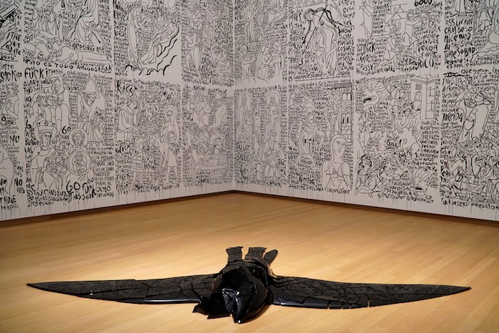 Otras obras tienen un significado especial y personal para Amorales. Es el caso de "Nube negra", una lluvia o plaga de mariposas de color negro que "pululan" en masa por las paredes de los museos donde se expone, adaptándose al espacio que les otorgan y que en el Stedelijk representan una especie de infinito de puertas.