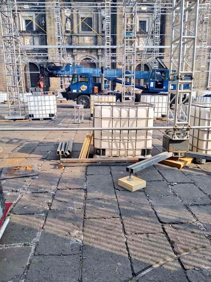 En un recorrido que realizó RAYAS por las inmediaciones de la Catedral, se pudo observar la destrucción de las lajas del atrio de la iglesia; en uno de los accesos hay un alud de tierra, la altura de la estructura para montar esta réplica está casi al mismo nivel que las torres de la iglesia y su longitud abarca toda la explanada y también se pueden observar grúas y vehículos pesados a pesar de que está prohibido.