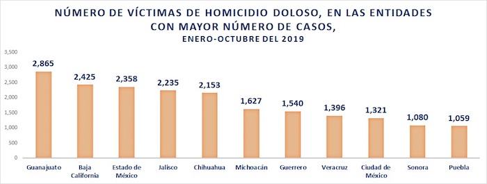 Así, en primer lugar aparece el estado de Colima, donde, según las estadísticas del Secretariado Ejecutivo, se cometen 70 homicidios por cada 100 mil habitantes (para el periodo enero-octubre del 2019); mientras que Guanajuato aparece ya en quinto lugar en esta lista con 36.53 asesinatos por cada 100 mil habitantes, desplazando a Guerrero al sexto sitio, con una tasa de 37.73 muertes por cada cien mil.