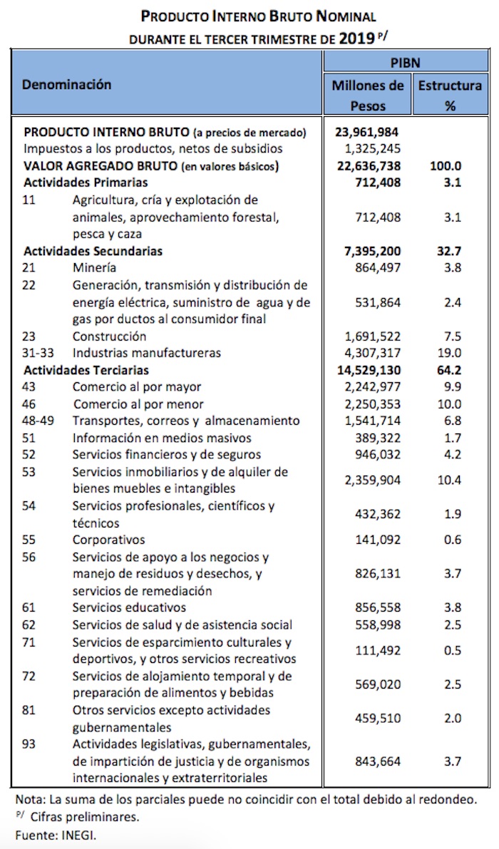 De julio a septiembre, el PIB nominal a precios de mercado fue de 23 millones 961 mil 984 pesos corrientes, (23 mil 962 billones de pesos), lo que representó un aumento de 2.8 puntos porcentuales relacionado al mismo lapso de 2018.