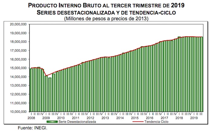 De acuerdo con el Instituto Nacional de Estadística y Geografía (Inegi), el PIB no tuvo variación en términos reales de julio a agosto de 2019 respecto los meses de abril a junio precedente.