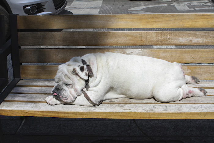 Un perro de la raza Bull Dog, descansa plácidamente sobre una banca de la calle Presidente Masarik en la colonia Polanco. Foto: Antonio Cruz, Cuartoscuro