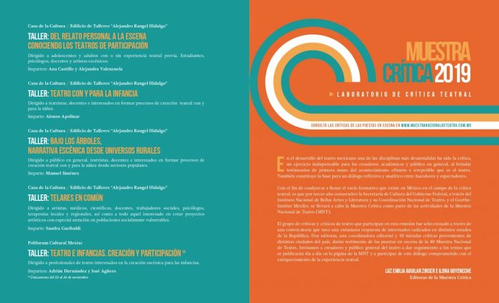 Nos complace que el ejercicio de la crítica tenga cabida y se vuelva consustancial a las actividades de la Muestra Nacional de Teatro. El laboratorio dirigido por Luz Emilia Aguilar Zinzer e Ilona Goyeneche es un espacio que propicia el diálogo con los creadores artísticos y promueve el respeto hacia una escena teatral de la que también somos parte. En un ambiente de formación, los lazos intelectivos y argumentales se entrelazan sobre una red interpersonal afectiva donde las opiniones, emociones y experiencias se convierten en un conocimiento que transita de manera horizontal. La Muestra Crítica espera con ansias la edición número 41 de la MNT.
