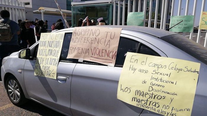 Desde las 5:30 de la mañana la comunidad universitaria se congregó en la entrada principal y colocaron múltiples cartulinas y consignas sobre la violencia y el acoso.