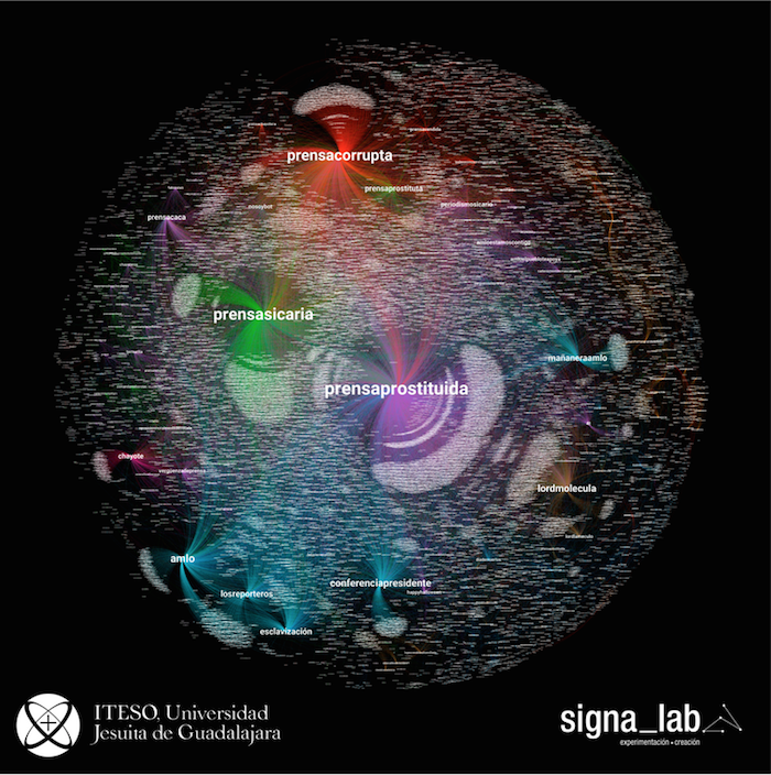 Entre el 31 y el 6 de noviembre, Signa_Lab analizó el comportamiento de algunos de los hashtags en contra de comunicadores que se volvieron tendencia en Twitter. El primer grupo de etiquetas: #PrensaSicaria, #PrensaCorrupta y #PrensaProstituida se llevó a cabo un primer análisis entre el 31 y 4 de noviembre, en las que se observó una alta participación de usuarios que permitió la descarga de una muestra compuesta por 17 mil 814 nodos, 49 mil 528 aristas y 95 comunidades que integran una red de interacciones que surgió a partir del empleo de las etiquetas.