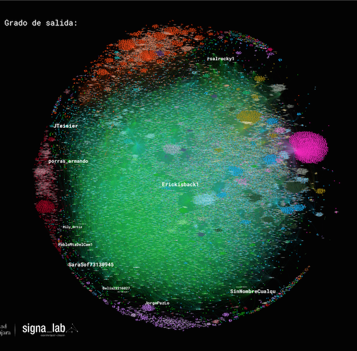 En una capa más profunda del análisis, Signa_Lab identificó las comunidades de usuarios que impulsaron estas etiquetas. En este segundo proceso identificaron una red de usuarios compuesta por 21 mil 929 nodos, 91 mil 3 aristas y 241 comunidades, en las que destacaron algunos usuarios por las numerosas interacciones que consiguieron al tuitear las frases denostativas y en apoyo a AMLO, en un primer caso de cuentas que fueron ampliamente retuiteadas o mencionadas y en un segundo de las cuentas que más realizaron estas acciones.