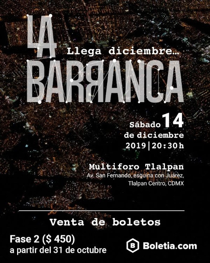 Ciudad de México, 14 diciembre (SinEmbargo).- Como parte de una tradición decembrina, La Barranca, agrupación mexicana surgida en la década de los 90, arribará este sábado 14 de diciembre al Multiforo Tlalpan con "Llega diciembre", un show especial para despedir el año junto a sus seguidores.