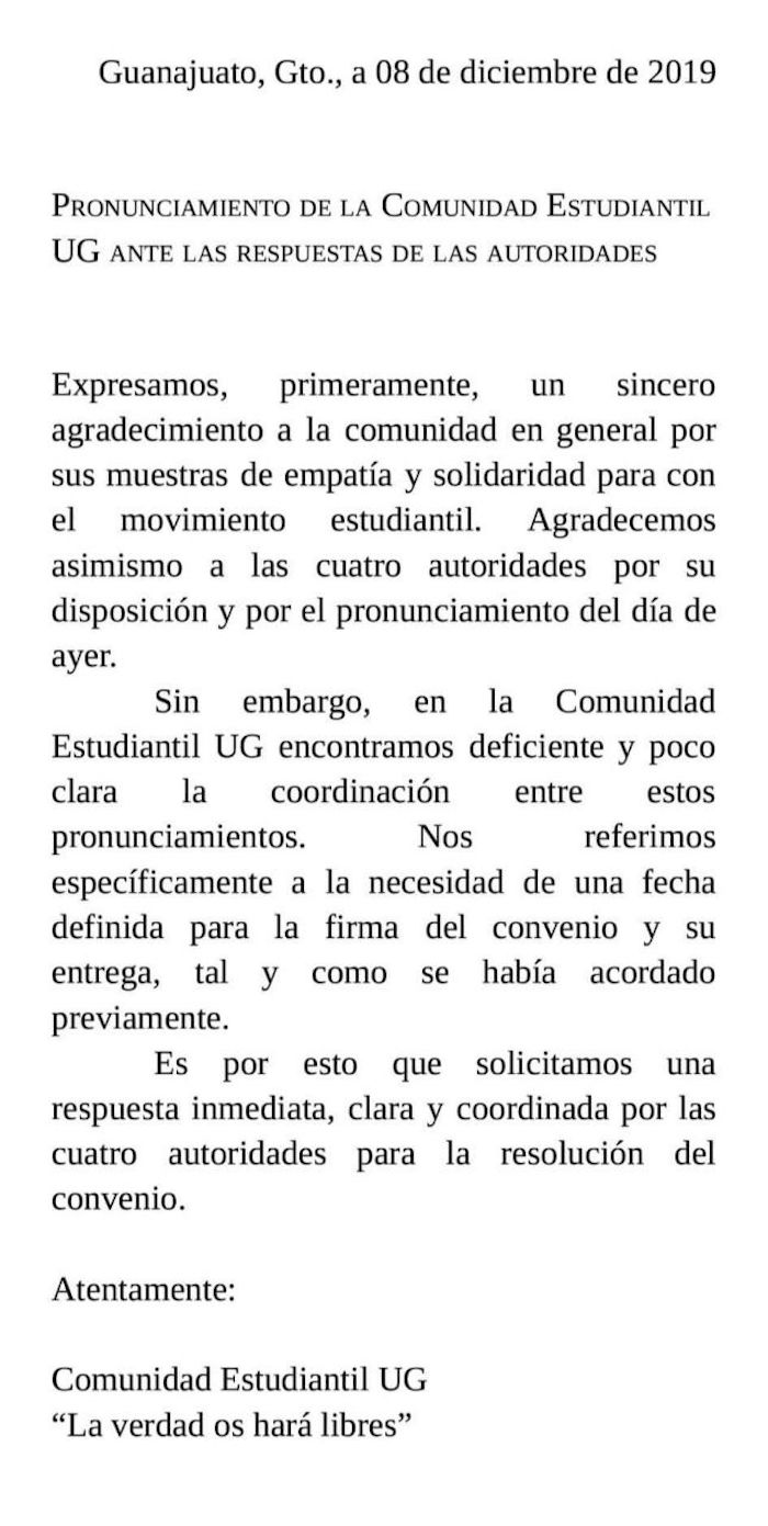 A falta de respuestas claras por las autoridades estatales y municipales, los estudiantes enviaron un comunicado en donde piden que haya fechas claras para la firma de convenio así como la respuesta del Secretario de Gobierno, Luis Ernesto Ayala; el alcalde Alejandro Navarro; el rector de la Universidad, Luis Felipe Guerrero Agripino y el Fiscal General del Estado, Carlos Zamarripa Aguirre.