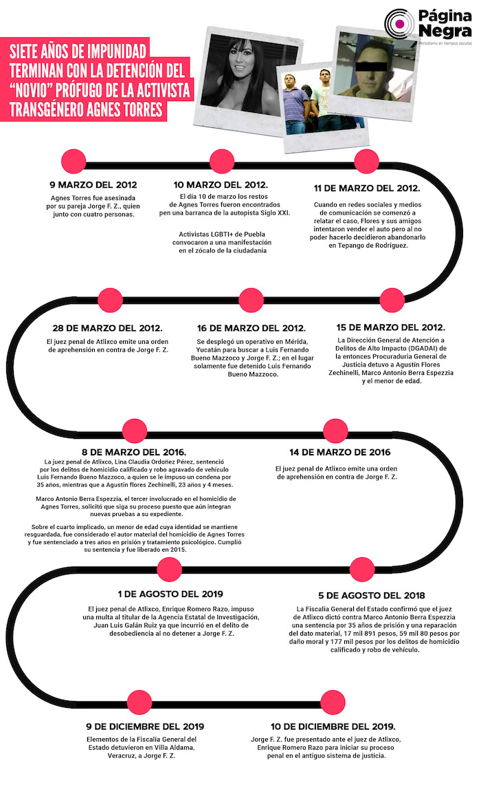 Puebla, 11 de diciembre (PeriódicoCentral).– La activista transexual Agnes Torres Hernández fue asesinada a manos de Jorge "N", a quien identificaba como su novio, según relataron sus amigos más cercanos. Jorge habría sido apoyado por cuatro de sus amigos, todos ellos originarios de la junta auxiliar de Chipilo en San Gregorio Atzompa, Puebla.