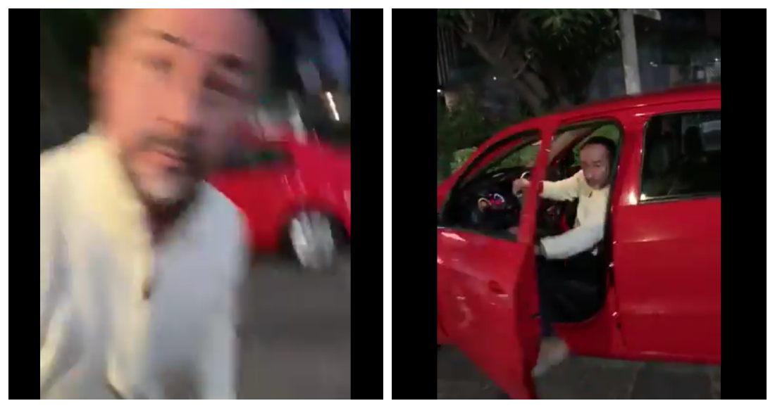 El hombre a bordo de un automóvil rojo maniobra en reversa y frena el carro. Al instante se baja del vehículo y confronta a joven quien supuestamente lo llamó "gato".