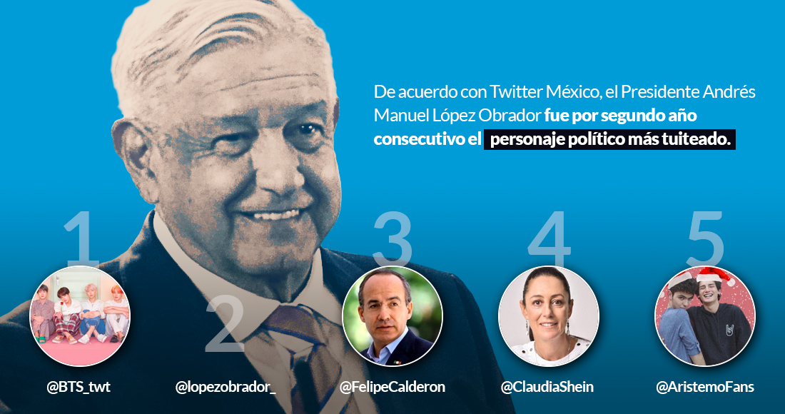 Aunque en la lista, el Primer Mandatario figura como el político con más menciones, no ha logrado desplazar del primer lugar al grupo de pop asiático BTS, quien por segunda ocasión es el personaje más tuiteado en México.