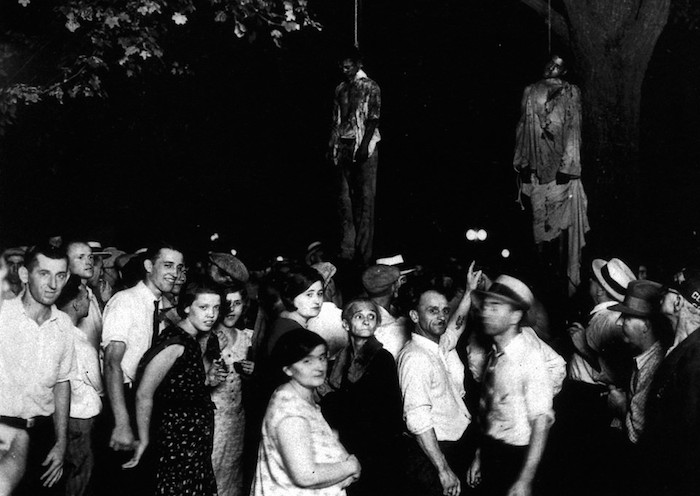 En el imaginario colectivo es precisamente en el sur donde se encuentra el epicentro del fenómeno y una imagen que todos hemos visto lo retrata: una cuadrilla ha capturado un hombre joven cualquiera, fornido, de raza negra, que no habla, no llora, no suplica, acusado injustamente de violar a una blanca, no mueve un músculo, mira. Endurecida por la indignación, la mirada está fija: por pupilas dos clavos negros y un blanco de los ojos tan blanco, tan puro, que brilla, haciendo el blanco más blanco que la piel de los blancos que escogen la rama para colgarlo.