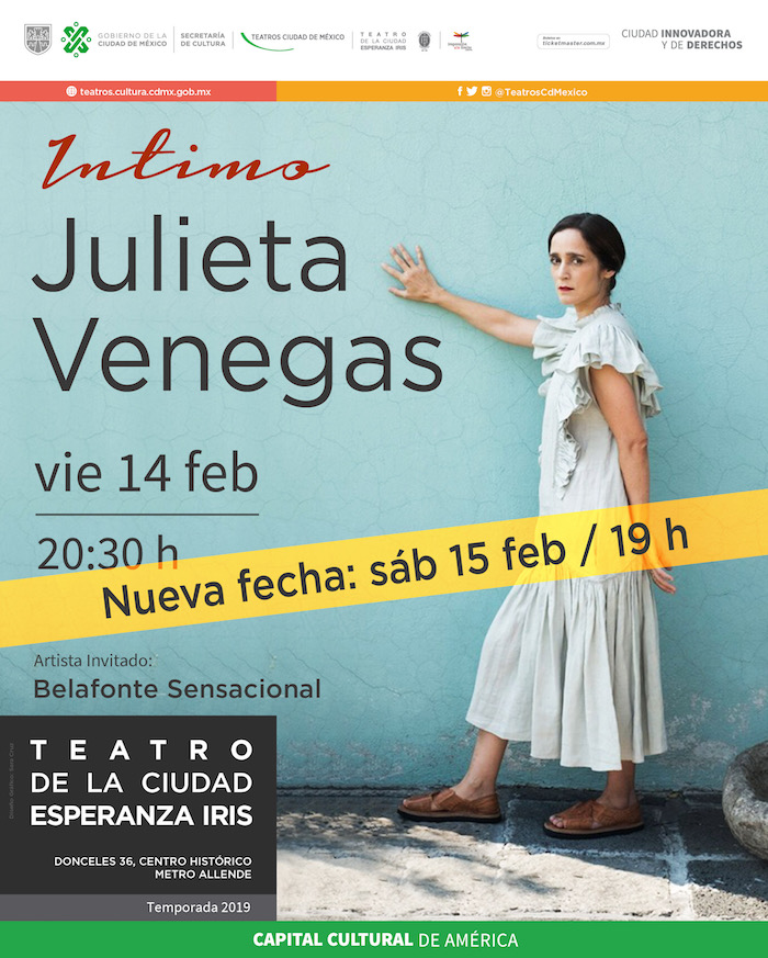 Los próximos 14 y 15 de febrero Julieta Venegas llegará al Teatro de la Ciudad Esperanza Iris para presentar "Íntimo", espectáculo en el que la cantautora se sube sola al escenario para interpretar varios temas de su autoría y algunos covers.