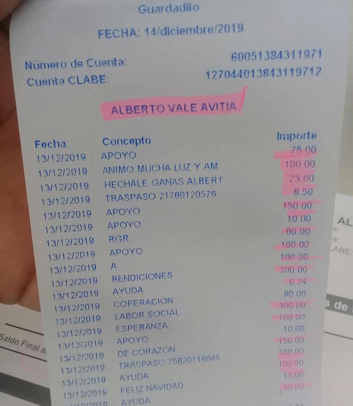 Cada uno de los depósitos de ayuda a Don Beto incluían palabras de solidaridad como "Feliz Navidad Don Beto, se lo merece por ser tan buena persona", "ánimo", "Échale ganas Albert", "Ánimo, mucha luz", entre otras.
