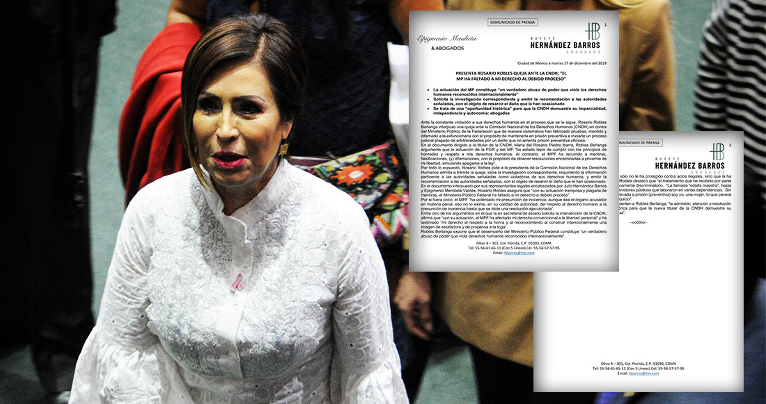 "Por todo lo expuesto, Rosario Robles pide a la presidenta de la Comisión Nacional de los Derechos Humanos admita a trámite la queja; inicie la investigación correspondiente, requiriendo la información pertinente a las autoridades señaladas como las violadoras de sus derechos humanos y emitir la recomendación a las autoridades señaladas, con el objetivo de resarcir el daño que le han ocasionado", informaron sus abogados en un comunicado.
