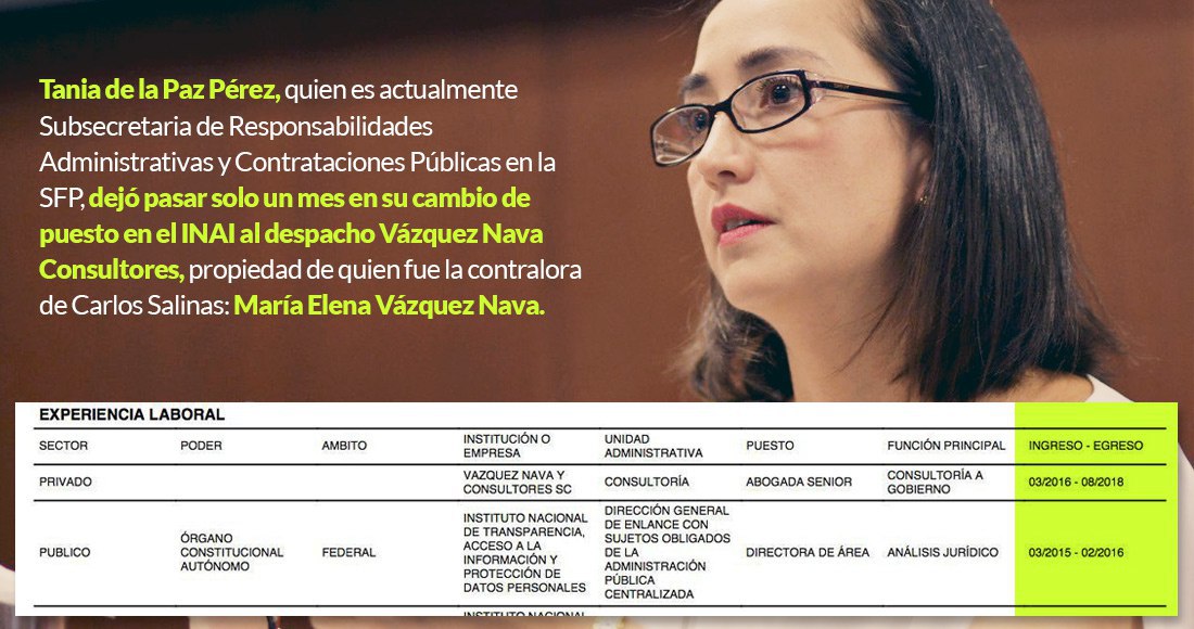 SinEmbargo le ha dado seguimiento a esta funcionaria de la SFP. Tania de la Paz Pérez, fue asociada senior de la empresa Vázquez Nava y Consultores, propiedad de la ex funcionaria salinista María Elena Vázquez Nava.