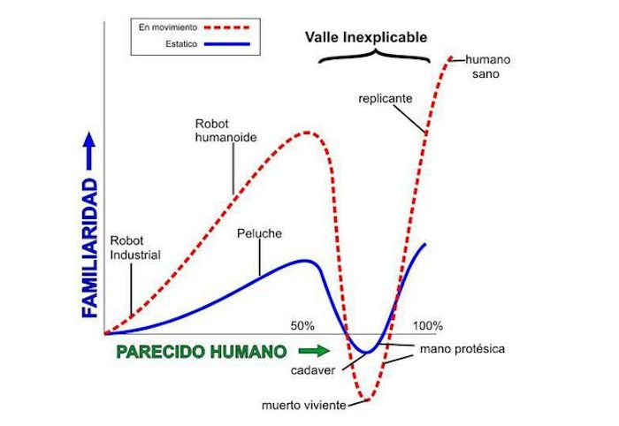 Esta hipótesis fue formulada por el japonés Masahiro Mori en 1970 y, aunque se suele aplicar al campo de la robótica, también tiene su reflejo en el séptimo arte. A grandes rasgos, viene a decir que la afinidad de las personas con los robots (o lo artificial en general) va creciendo a medida que estos parecen cada vez más reales.