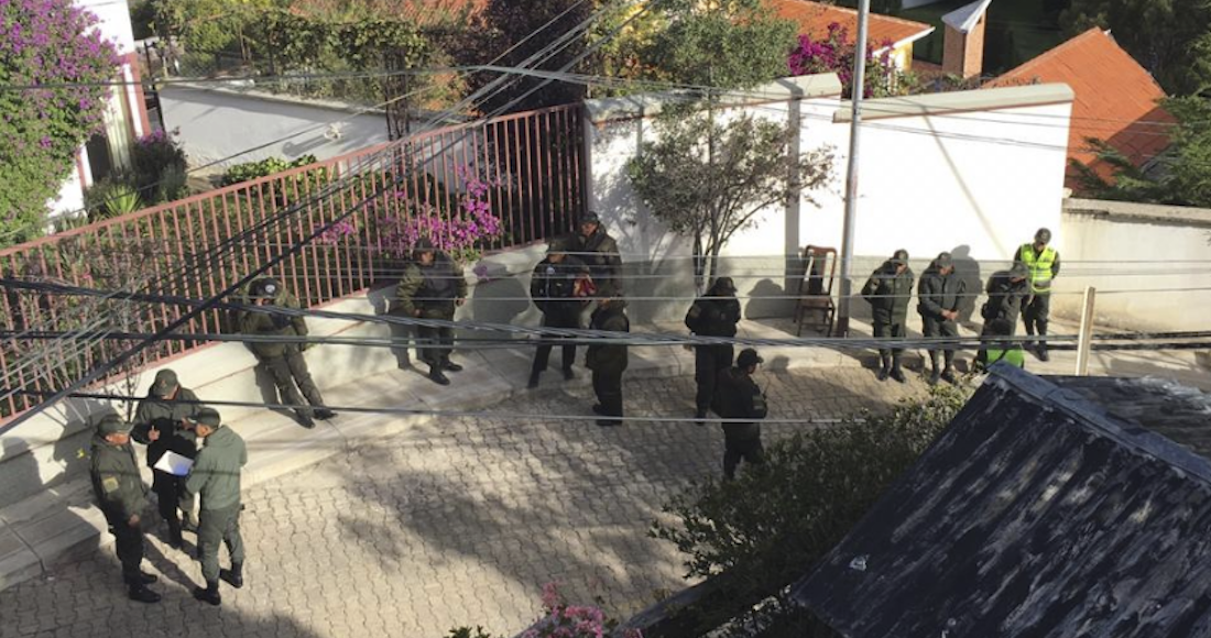 Denunciamos que se mantiene el secuestro policíaco y militar en contra de las instalaciones diplomáticas de ?? en ??. Estamos en alerta permanente ante el riesgo de una incursión armada a nuestros inmuebles en La Paz. pic.twitter.com/4rwewRAzgL