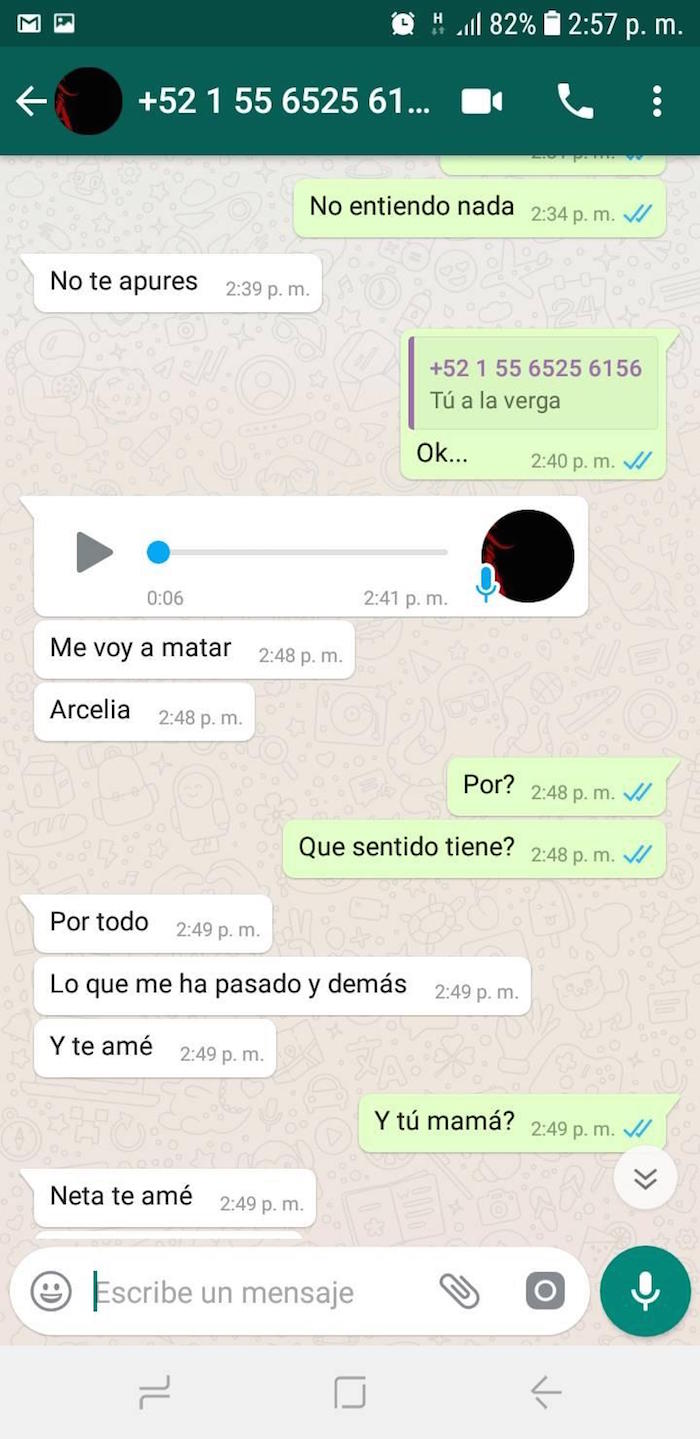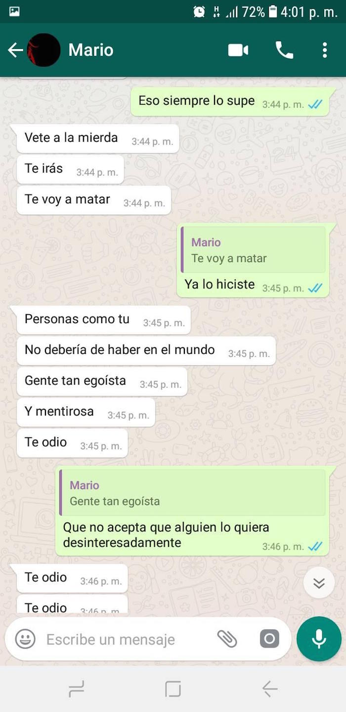 “Me voy a matar por todo lo que me ha pasado y demás. Y te amé”, escribió el sujeto. “Sé feliz con él. Te ves feliz con él. Moriré. Esto no se va quedar así. Se metieron con el peor”, agregó en una conversación.