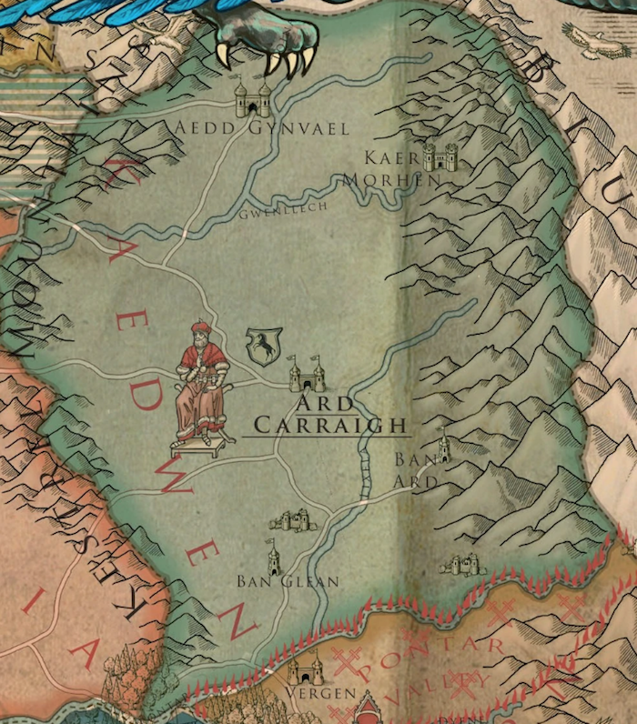 El mayor de los cuatro reinos del Norte es Kaedwen, donde tienen lugar algunos de los eventos más importantes de la historia de The Witcher. Al este, junto a la frontera de las montañas azules, se encuentra la fortaleza de Kaer Morhen, donde los brujos entrenan y donde el propio Geralt pasó parte de su tiempo bajo la tutela de Vesemir. Ard Carraigh es la capital del reino, y su escudo de armas es un unicornio negro y dorado.