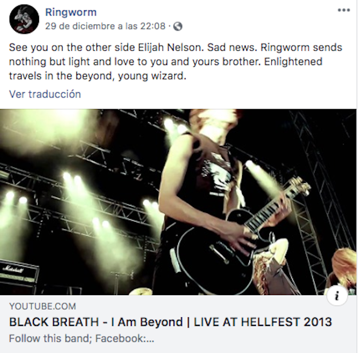 “Nos vemos en el otro lado, Elijah Nelson. Tristes noticias. Ringworm no te envía más que luz y amor a ti y a tu hermano. Viajes iluminados en el más allá, joven mago”, escribió en Facebook la agrupación de punk hardcore, Ringworm.