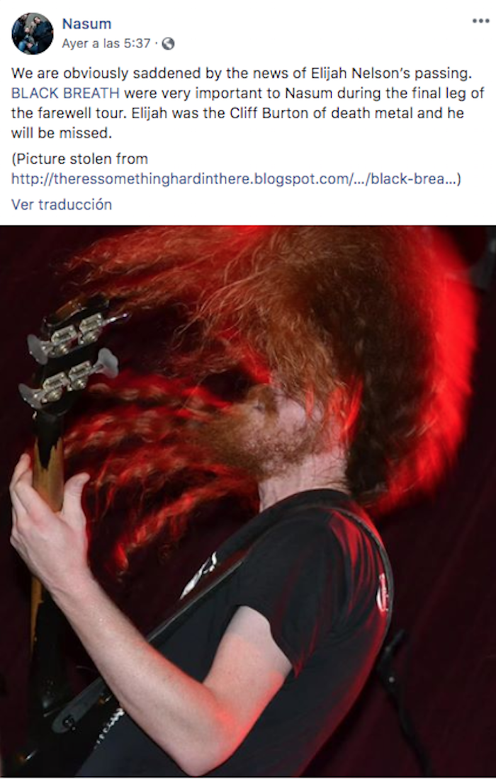 También la banda sueca, Nasum lamentó la muerte del bajista: “estamos tristes por la noticia del fallecimiento de Elijah Nelson. Black Breath fue muy importante para Nasum durante la etapa final de la gira de despedida. Elijah era el Cliff Burton del death metal y lo vamos a extrañar”.