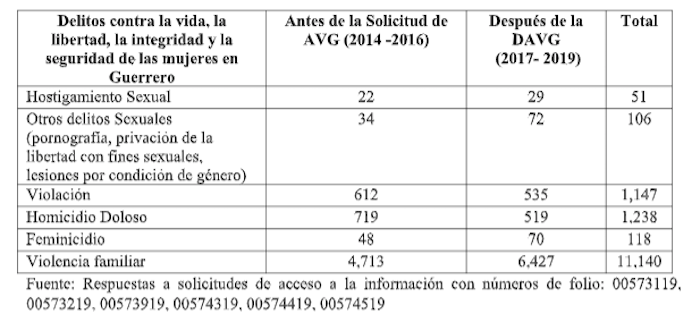 De acuerdo con información que forma parte del procedimiento de Alerta de Violencia de Género en Guerrero, publicada el 22 de junio de 2017 en la página de la CONAVIM, de 2009 a 2016, la Fiscalía General de Justicia del Estado de Guerrero registró 30 mil 711 casos de mujeres víctimas de los delitos de lesiones, secuestro, desaparición, violencia familiar, violación sexual, hostigamiento sexual y trata en los municipios de Acapulco de Juárez, Ayutla de los Libres, Chilpancingo de los Bravo, Coyuca de Catalán, Iguala de la Independencia, José Azueta, Ometepec y Tlapa de Comonfort (posteriormente el Congreso del estado exhortó al Ejecutivo estatal para que se incluyera el municipio de Chilapa de Álvarez, dado el contexto de violencia en el que viven las mujeres en ese municipio). Sin embargo, no especifica si en todos estos casos se iniciaron averiguaciones previas o carpetas de investigación y mucho menos el estado actual de los casos.