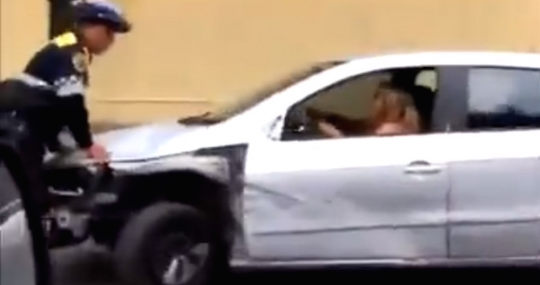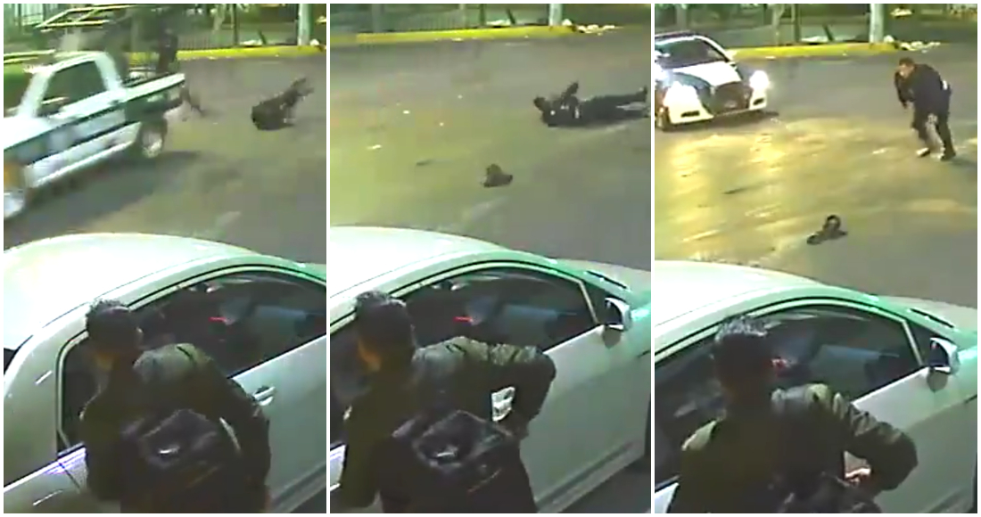 El oficial se incorpora al momento levantando algunas pertenencias que soltó al momento de caer y comienza a dirigirse a al vehículo que lo tiró. Además se observa como un carro que iba pasando sobre la calle se detiene al ver al policía tirado y un joven que iba abordar un carro observa lo sucedido.