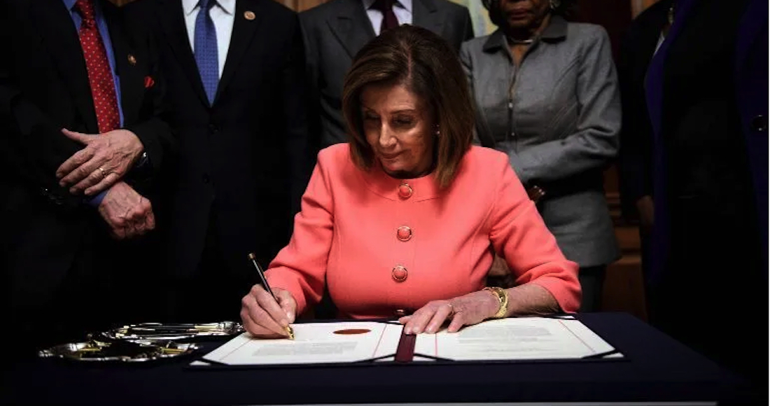 Antes de enviar los cargos, conocidos formalmente como artículos para un juicio político, Pelosi firmó el documento que los contenía con una veintena de bolígrafos, que luego repartió entre los asistentes a una solemne ceremonia en la Cámara Baja.