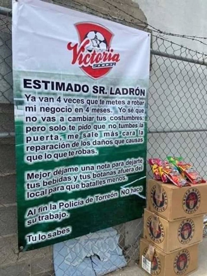 "Estimado Sr. ladrón: ya van cuatro veces que te metes a robar mi negocio en cuatro meses. Yo sé que no vas a cambiar tus costumbres, pero solo te pido que no tumbes la puerta. Me sale más cara la reparación de los daños que causas que lo que te robas. Mejor déjame una nota para dejarte tus bebidas y tus botanas afuera del local para que batalles menos. Al fin la Policía de Torreón NO hace su trabajo. Tú lo sabes".