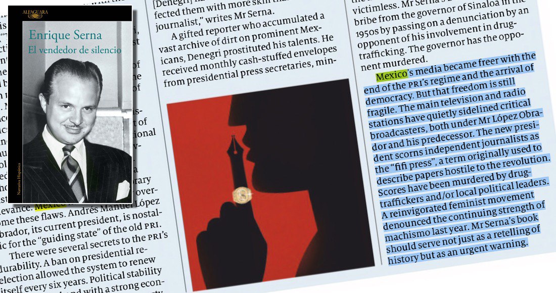 “Los medios de comunicación de México se volvieron más libres con el fin del régimen de PRI y la llegada de la democracia. Pero esa libertad sigue siendo frágil. Las principales estaciones de televisión y radio han silenciado a los comunicadores críticos, tanto bajo el mando de López Obrador como de su predecesor [Peña Nieto]. El nuevo Presidente menosprecia a los periodistas independientes llamándolos ‘prensa fifí’, un término utilizado originalmente para describir roles hostiles a la Revolución [Mexicana]. Decenas han sido asesinados por narcotraficantes y/o líderes políticos locales. Un movimiento feminista revitalizado denunció el año pasado que el machismo continúa. El libro de Serna debería servir no solo como un recuento de la historia sino como una advertencia urgente”, dice la publicación, que ha expresado, por años, su desacuerdo con López Obrador, al que considera ‘populista”.