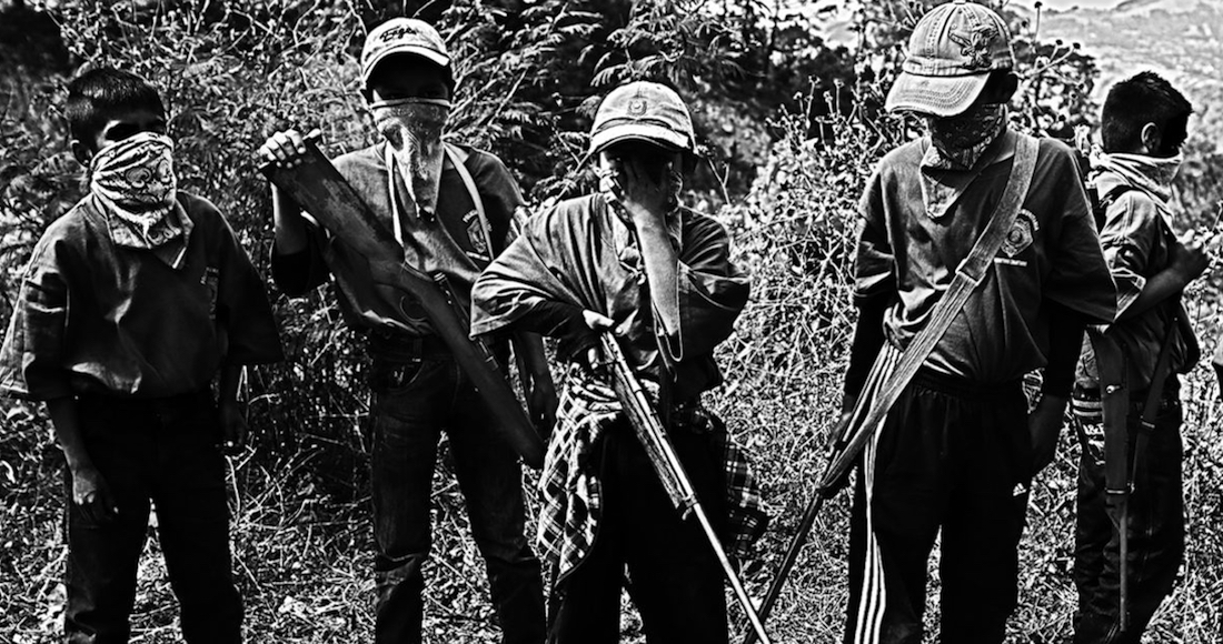 Con armas bajo custodia, uniformados con una camiseta de la policía comunitaria, cubiertos del rostro y un miedo que se refleja en su mirada, los menores se encargan de la seguridad, junto con los adultos, en su pueblo.