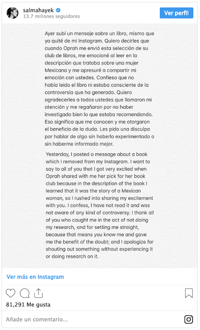 En un video publicado el fin de semana pasado en Instagram, Winfrey dijo que ahora se da cuenta de que el libro tocó una “fibra sensible” con los latinos y creó la necesidad de una conversación más profunda. Winfrey quiere tener un debate sobre las políticas editoriales para un especial de Apple TV en marzo.