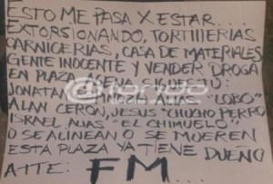 Además, cerca del cadáver fue hallada una cartulina con un mensaje: “ESTO ME PASA X ESTAR EXTORSIONANDO, TORTILLERÍAS CARNICERÍAS, CASA DE MATERIALES GENTE INOCENTE Y VENDER DROGA EN PLAZA AJENA, SIGUES TU: JONATAN ESPINOZA ALIAS “LOBO” ALAN CERON, JESUS “CHUCHO PERRO ISRAEL ALIAS “EL CHIMUELO” O SE ALINEAN O SE MUEREN ESTA PLAZA YA TIENE DUEÑO ATTE: FM…”.