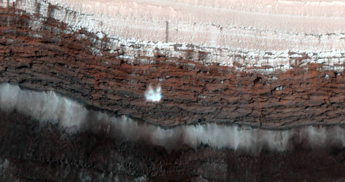 Así es como se formó el depósito, sugieren los investigadores: a medida que Marte se tambaleó en su eje de rotación en los últimos 510.000 años, el polo sur recibió cantidades variables de luz solar, permitiendo que se formara hielo de CO2 cuando los polos recibían menos luz solar y causó que sublime cuando los polos estaban más soleados. Cuando se formó hielo de CO2, pequeñas cantidades de hielo de agua quedaron atrapadas junto con el hielo de CO2. Cuando el CO2 se sublimó, el hielo de agua más estable se dejó atrás y se consolidó en capas.
